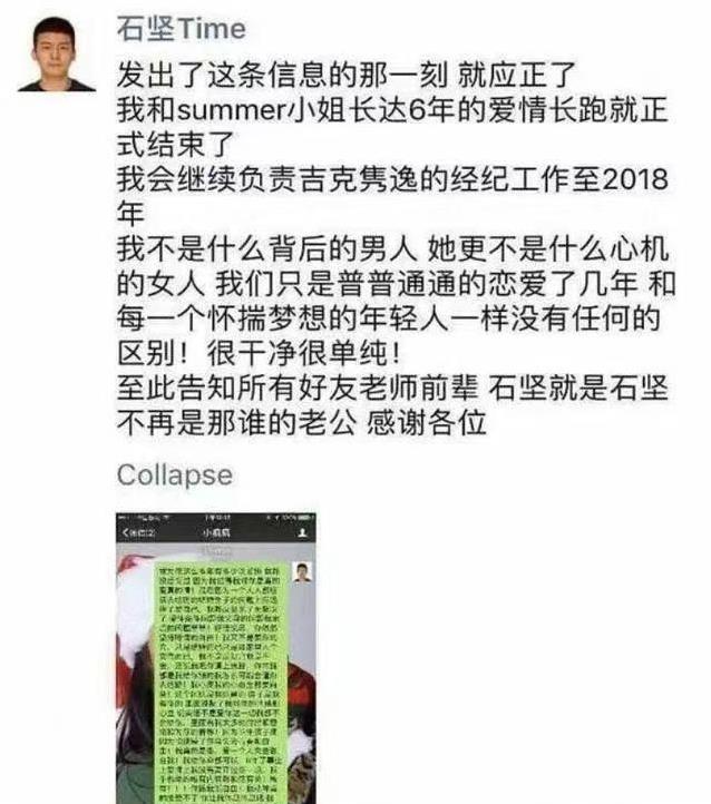 事情是这样的。吉克隽逸和前男友刘石坚恋爱六年,他想结婚求稳定,她却想先拼事业,俩人没谈拢,2016年分了手。2017年,刘石坚火速结婚,网友还夸吉克隽逸清醒、不恋爱脑。可刘石坚的老婆突然发声,说自己在怀孕时,吉克隽逸还给刘石坚发暧昧消息,暗指她炒作节目热度。这话像扔了颗炸弹,网上骂声一片。