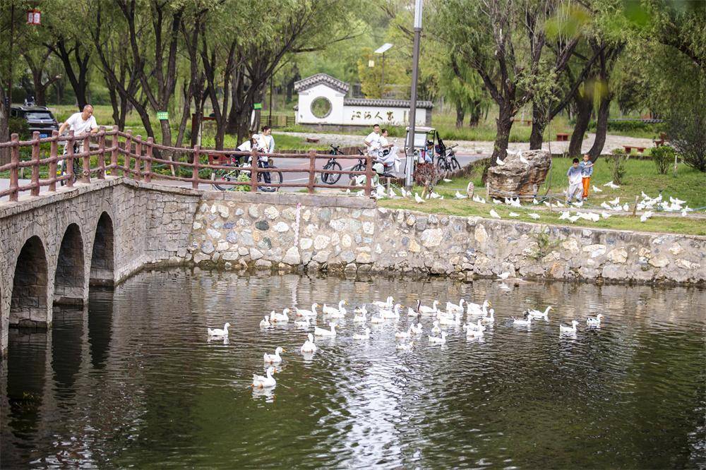 10月1日,河北省邯郸市复兴区沁河郊野公园,市民和游客正在沁河岸游玩。聂长青摄